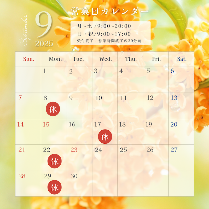 皆さんこんばんは院長の田尾です!本日は9月の休業日についてお伝えしたいと思います!9月はお写真の様になりますのでご確認の程よろしくお願いいたします✨来月も皆様のご来院スタッフ一同心よりお待ちしております✨