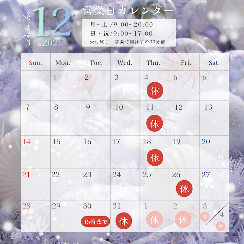 12月、年末年始のお休みはお写真のようになりますので、ご確認の程よろしくお願いいたします😊